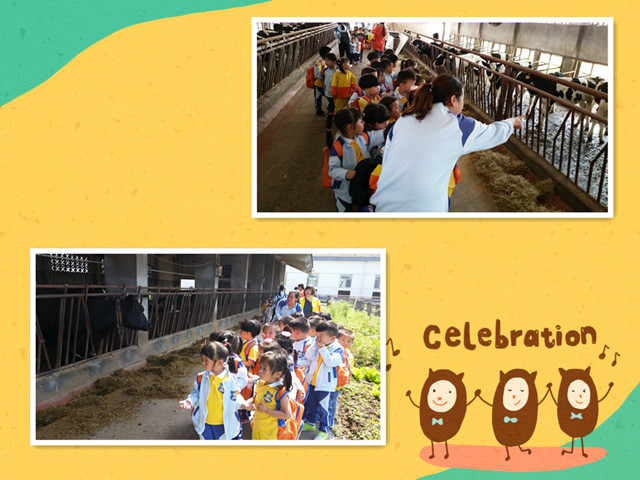 然后,便是宝贝们最激动的时刻了,孩子们小手拉小手拍着整齐的队伍去看奶牛啦!一进入牛舍,便看到一头头大奶牛站在牛棚里吃草、喝水,还时不时地朝孩子们“哞哞”叫,孩子们兴奋地观望、谈论。大胆点的小朋友还和出生几个月的小小牛来了个亲密接触,拿着奶牛喜欢吃的草料说:“小奶牛你吃我的!”“我的是最嫩的!”同时,孩子们也仔细观察到每一间牛舍都标有不同的数字,代表着不同的年级,跟人类孩子分班上学生活一样,很有趣。