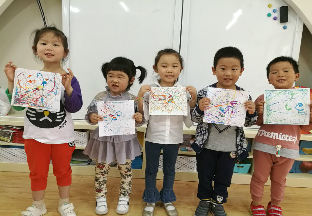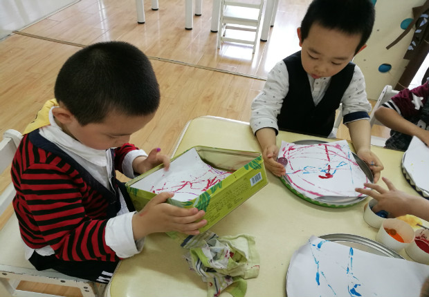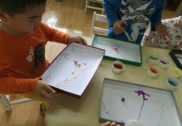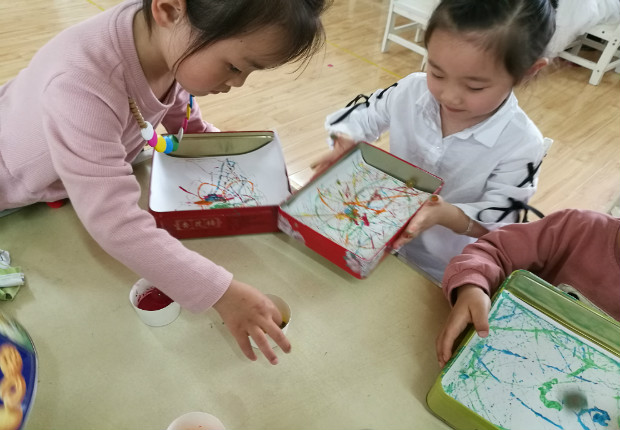 结合本月艺术节美术专场主题我们开展了本次活动,让孩子尝试用弹珠蘸上颜料在盒盖上进行左右、上下、画圆滚动,当老师把作画的工具放到桌子上时,孩子们迫不及待的要一展身手,孩子们将弹珠滚一滚,滚出纵横交错的线条;将弹珠跳一跳,跳出醒目的小点点;将弹珠转一转,转出大小不一的漩涡……在教师的引导下,幼儿从一开始随意玩,到慢慢探索控制弹珠的走向,再形成各种漂亮的图案,幼儿感受到滚画和色彩融合的美妙,体验到玩色的乐趣!