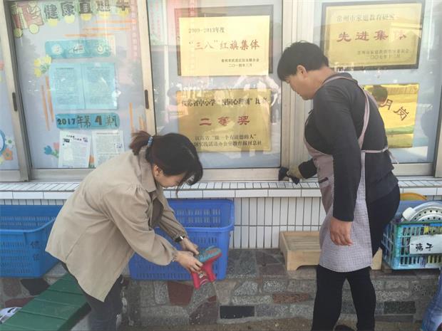 过程中,检查与指导并重。适时调整了户外沙池用品、幼儿雨鞋等摆放位置;对户外活动的器械,如铁环、刀、棍等进行了安全的摆放;对卫生死角进行了严密监控并落实责任;对角落堆放的学习材料进行归库整理……