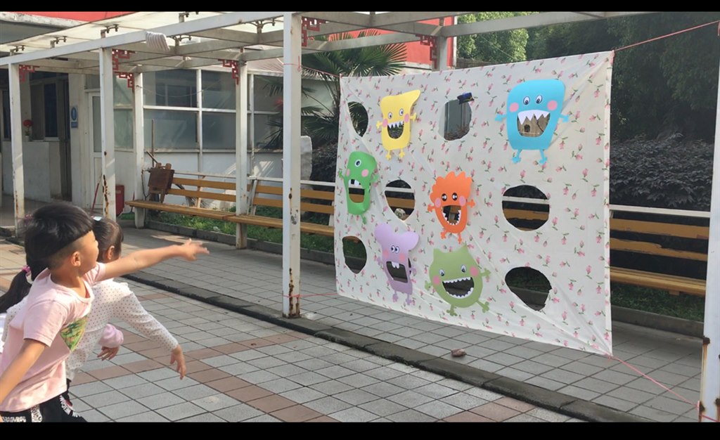 孩子们玩得越来越嗨,与材料的互动也越来越丰富。一个个圆圆的洞在孩子们眼中变成了一张张大嘴巴,于是,沙包就变成了食物。对准“大嘴巴”,用力的投过去。
