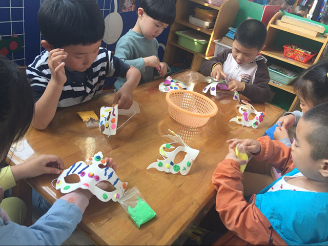 红东幼儿园作为陶艺特色幼儿园,孩子们与泥每天都有亲密接触。中二班的孩子们今天要用彩色太空泥来装饰有趣的面具。