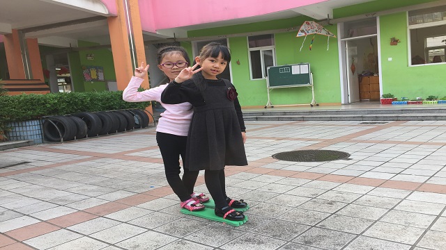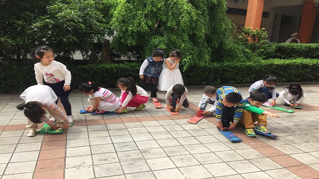 这天早上,大四班的小朋友带来了一双妈妈的大鞋子,这下教室里炸开了锅,孩子们都想来试一试,第二天更多的孩子带了大鞋来,这天我们的晨间活动——穿大鞋就在孩子们自发组织之下开展起来了,你瞧,穿上大鞋的孩子们走、跑、跳、攀爬都难不倒他们。他们还利用幼儿园里的轮胎、圆圈、竹梯等材料,让游戏更加具有挑战性。在尝试了自己走大鞋后,孩子们还突发奇想,两两组合在一起玩起了两人三足的游戏。一双双普通的鞋子在孩子们手中变成了游戏的材料,玩出了许多新花样!
