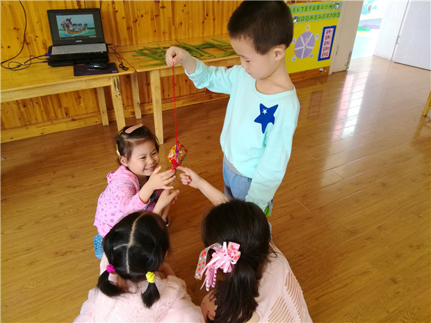 在谈话活动“端午节的来历和风俗”中,孩子们了解并认识了“屈原”,知道了在这一天人们为了纪念这位伟大的人物要包粽子,赛龙舟,插菖蒲……包粽子、吃粽子是端午节的重要习俗之一。在幼儿园里,孩子们利用特殊的“粽叶”、“糯米”、“馅料”等多种材料,在游戏中体验“包粽子”的乐趣。小巧可爱的香囊,深得孩子们的喜爱,纷纷争着介绍自己的香囊是什么颜色的,闻起来怎么样。老师还告诉孩子们,端午节佩香囊,不仅有避邪驱瘟之意,而且有襟头点缀之风。
