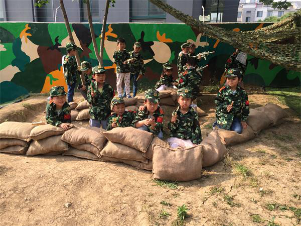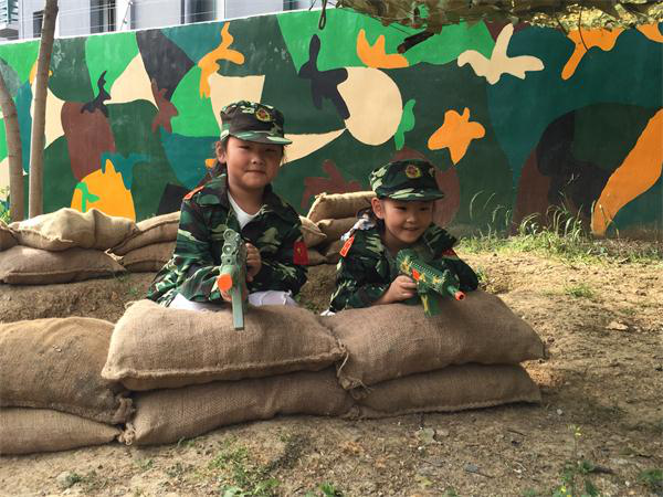 孩子们真的是天生的表演家,他(她)们完全沉浸在角色中。瞧,滚、翻、匍匐前进、攀爬、跳跃,成为孩子们历练的场地。野战游戏中尽显孩子们的不同个性,生龙活虎,群情振奋。野战炊事班角色的增设给野战营又增添了一份趣味,只见有的孩子打仗累了,端着枪戴着帽神气活现跑到炊事班,对炊事员说:快,快,快,我打了一会仗饿死了,给我煮碗馄饨……