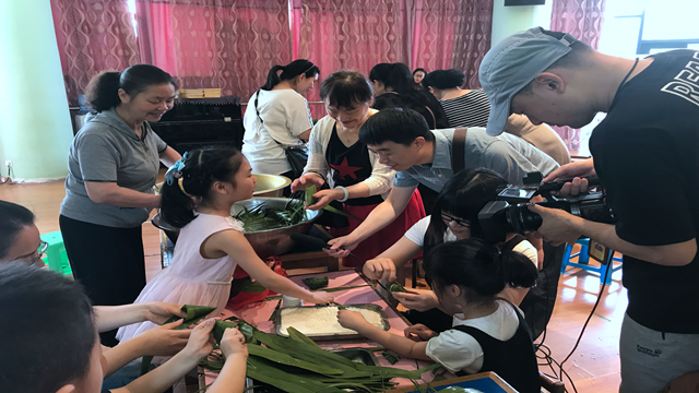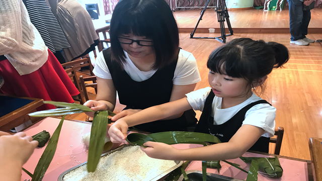 5月27日上午,我们邀请来了家长志愿者、社区的阿姨们和孩子们一同在幼儿园里包粽子。