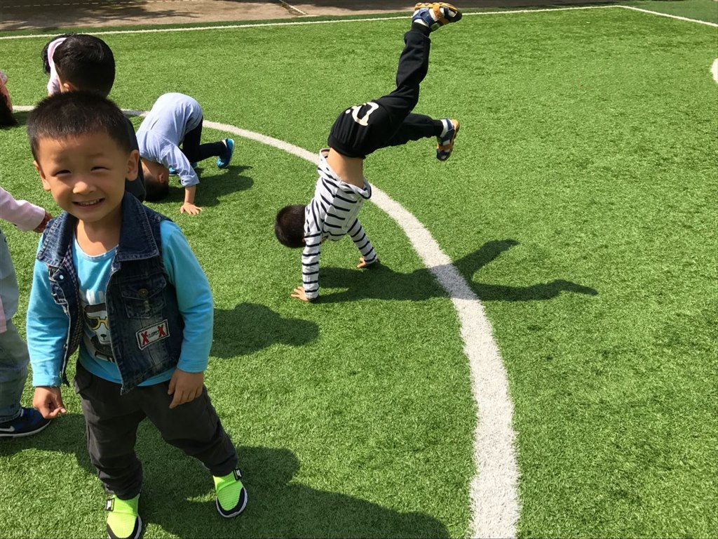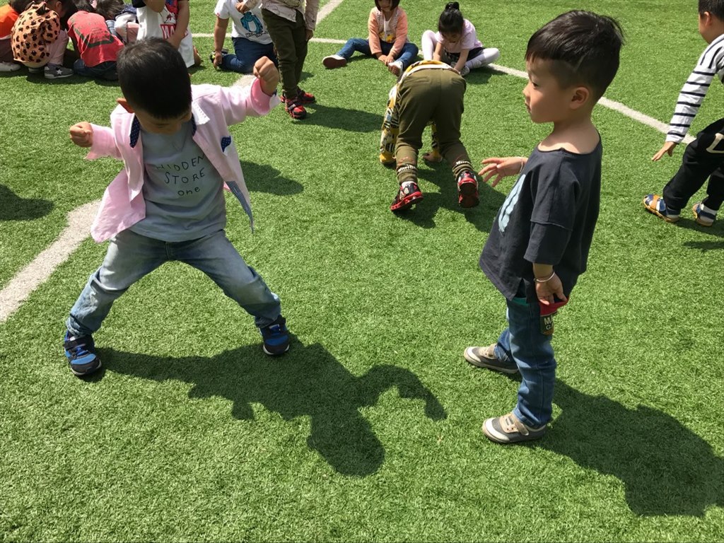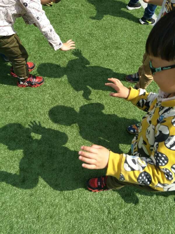 红东幼儿园小班的孩子们学习了儿歌“阳光”,孩子们静静地在草地上休息,几个孩子在玩影子的游戏。