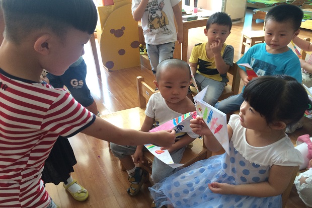 中大班的哥哥姐姐们来到小班弟弟妹妹中间,结成“一对一”式的好朋友,一起上课、一起做游戏,哥哥姐姐与弟弟妹妹相互问好。帮哭泣的弟弟妹妹擦眼泪、讲故事,关爱的神情溢于言表。弟弟妹妹动作不够协调,哥哥姐姐大手牵着小手,协助弟弟妹妹入厕、洗盥、喝水,并提醒弟弟妹妹慢慢走小心滑。穿衣、叠被、穿鞋等环节,彰显出大哥哥姐姐们“我能行”的姿态。另外,在端午佳节来临之际,大班的哥哥姐姐亲手制作了节日礼物,并将其赠送给小班的弟弟妹妹。