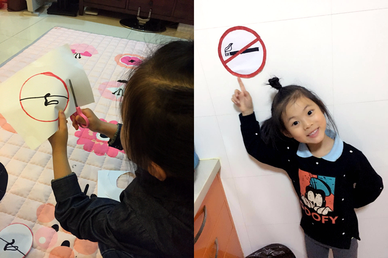 在活动前期,我们通过图片、故事和小实验等方式让幼儿了解吸烟不仅危害自己及家人的健康,还会污染环境,小家伙们都说,在家里爸爸或者爷爷会躲着抽烟,卫生间、厨房、阳台,但是那样依然会有很浓重的烟味!为了我们的身体健康,让爸爸、爷爷等吸烟人群加入禁烟的行动中来,孩子们自发讨论协商回家和爸爸妈妈一起做一个禁烟的小标识,并且亲自贴在醒目的地方,时刻提醒他们禁止吸烟!