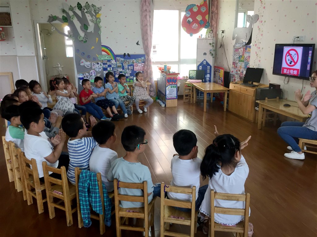 为了让幼儿了解吸烟对人体及周围环境的危害,知道公共场所不能吸烟,提高幼儿的环保意识,在5月31日世界无烟日到来之际,香缇湾大风车幼儿园大班组织开展了“禁烟小卫士”的活动。
