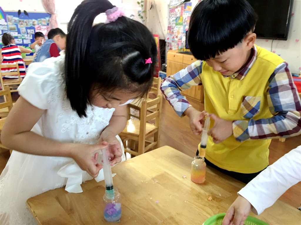 色彩缤纷的海洋宝宝,透明的塑料瓶,还有孩子们喜欢玩的针筒,激发了每个孩子的创作热情,让我们在这个初夏感受到了别样的清爽!看,他们将五彩晶莹的海洋宝宝,根据自己的爱好将不同的颜色放进针筒里,涨红了小脸往透明瓶内挤压,直到铺满整个瓶子。看着自己亲手创造的“彩虹瓶”,孩子们一个个开心的和小伙伴们一起讨论“彩虹瓶”还可以做什么呢?瞧,几个小朋友带来了几种种子,他们在彩虹瓶内放上一颗种子,守护等待它们发芽,希望到时候能收获的不仅仅只是一个装饰品,更是一份绿色的希望!