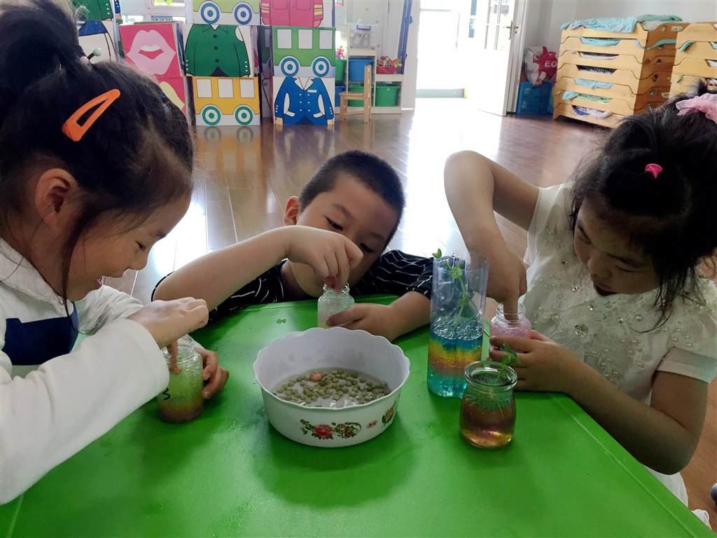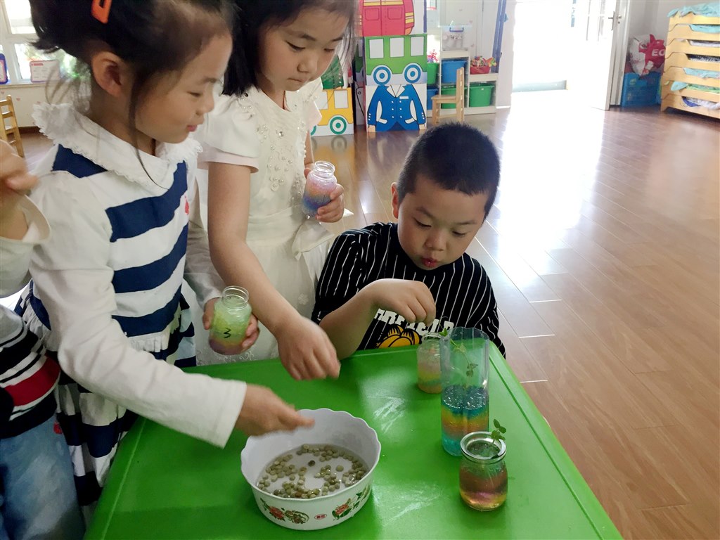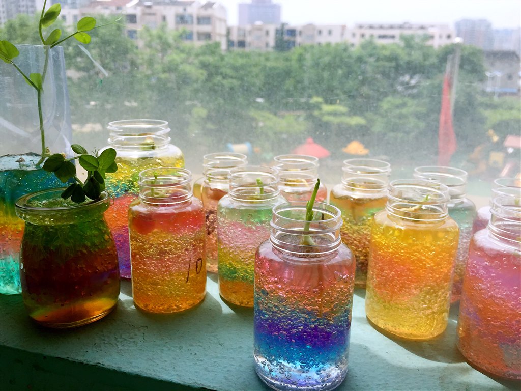 清新的初夏是促进幼儿观察力发展和丰富知识了解植物生长的最好阶段。创意十足的“彩虹瓶”为小小自然角增添了一份生机,大大的开阔了孩子们的眼界。而在照料这些“小生命”的过程中,孩子们了解了植物的生长、变化特征,促进了认知水平的发展。同时也促进了情感、艺术欣赏及创造能力发展。