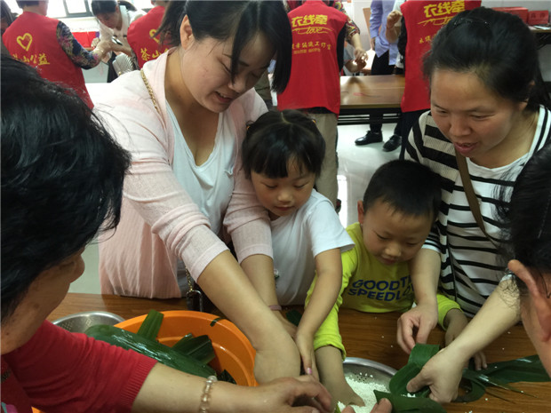 小小志愿者们在社区工作人员的带领下,一起学习包粽子、编织五彩蛋袋,活动现场气氛热烈,其乐融融。只见包粽子能手们飞快的拿起粽叶卷成漏斗状,填米、压实、扎绳。一只只可爱的粽子便诞生了。一个个美丽的蛋袋也在妈妈、宝贝们的共同努力下、巧手翻飞中编织而成。