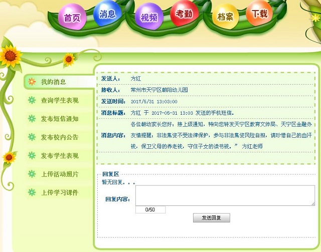 近日,接上级通知,要求区各单位利用校门LED屏、短信平台等多种手段向学生家长发送“珍惜自己的血汗钱,保卫父母的养老钱,守住子女的读书钱。非法集资不受法律保护,参与非法集资风险自担”的公益短信。朝阳幼儿园在第一时间看到通知就行动起来,利用幼儿园多种宣传渠道,如宝宝在线、大门口宣传栏和班级门口的家长园地,向家长进行广泛动员宣传,尤其是家长园地的宣传单,关注家长多,幼儿园一些年纪较大的家长对于幼儿园的这一举措纷纷点赞。朝阳幼儿园因园制宜,根据本园新市民家长多、接送孩子爷爷奶奶多的情况,多通道宣传,有效落实了上级部门的工作,给朝阳幼儿园宣传组点赞!