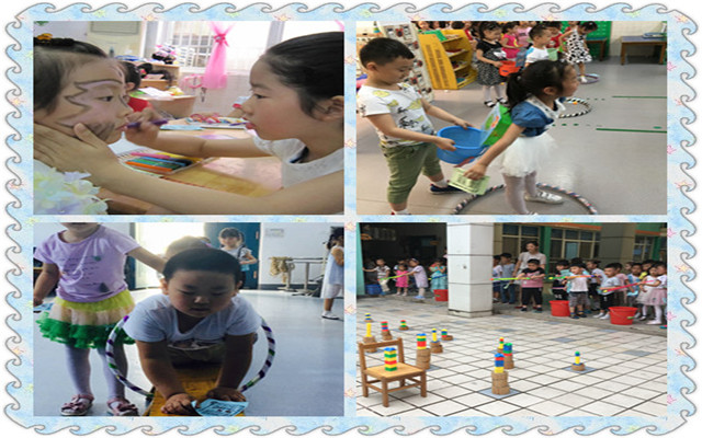 “来,小妹妹,今天儿童节,我来给你打扮打扮。”孩子们用五彩的画笔相互在脸上尽情地作画,变成小花猫、小蝴蝶和蝙蝠侠等等,真可爱啊!除了漂亮的脸部彩绘,还有很多好玩的游戏呢!看,孩子们在草地上快乐前进,闯关成功用沙包炸碉堡,一个个都是神气的特种兵;还有的在玩疯狂的小鸟“耶!我射中啦!”;还有的在互帮互助中体验合作的乐趣,“我跳、跳、跳跳跳......”一个跳一个接,在合作中完成了母鸡孵蛋的游戏。“看,我孵了这么多蛋呢!”······大孩子带着小孩子在各种游戏中自由穿梭,人体洞洞墙、挑战五环、快乐射手、打地鼠、球儿滚滚等游戏中,都留下了他们快乐游戏的身影,别提有多高兴了!