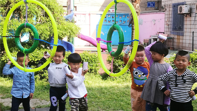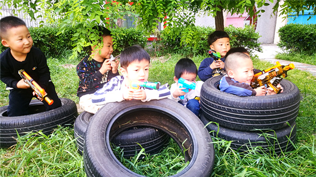 游戏玩法谁做主? 谁最勇敢听谁的!活动中,孩子们自己评选出小队长,带上玩具枪跟着小队长进行一场探险之旅,重重难关也并不能阻挡小战士们的脚步,穿越黑暗的隧道、钻过鲨鱼山洞、炸碉堡,他们克服困难,勇往直前。孩子们投入了真实的战争情境,有的冲锋陷阵奔跑在阵地最前沿,有的打一枪换一个地方,有的善于保护自已,躲在轮胎边、在草丛中埋伏、伪装成大树,孩子们投入进了游戏中,有的孩子像个小演员似的,演起了自己中弹的样子,当孩子们抓住敌人后,校园的上空传来阵阵孩子们的欢呼声。游戏中尽显了孩子们的不同个性,一个个生龙活虎,玩得趣味横生!