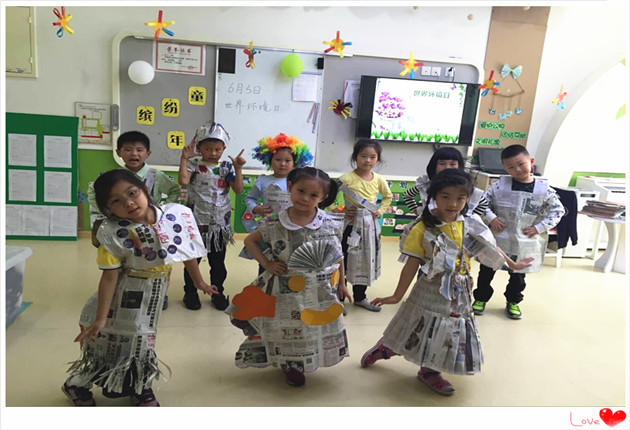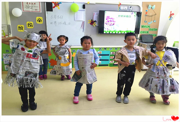为了倡导回收循环再利用,孩子们早在一个星期前就开始收集各种各样的报刊杂志了。从收集的过程中,孩子们了解了报纸的分类、报纸的来源、报纸的用途等,最后变成我们今天活动的主角。我们的目的是要让报纸能够“走”起来、show出去。孩子们用小剪刀剪剪贴贴,水彩笔勾勒出自己喜欢的图案,没过多久,一套套由爸爸妈妈和宝贝一起设计制作的报纸服装就诞生了,穿上自己设计的服装走一走T台别提多开心了。不但让孩子们从自己做起,增强了孩子保护环境、爱护环境的决心,同时也能带动自己的爸爸妈妈一起“保护环境,从我做起”。