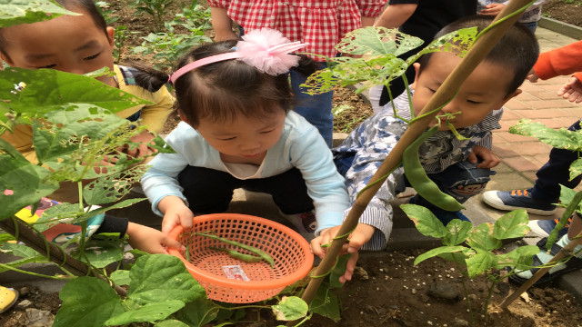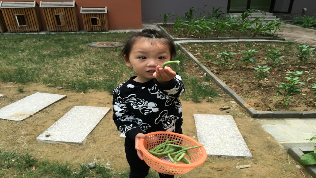 噢,原来是阿姨和保安老伯种植的四季豆、茄子、黄瓜、青椒等蔬菜都结出了果实。孩子们看着紫色的茄子挂在茎上,毛绒绒的黄瓜吊在藤上,长长的四季豆躲在绿油油的叶子里.....喜不自禁。懂孩子的老师们看出了孩子的想法。不仅让孩子和蔬菜亲密接触,还准备了小箩筐,鼓励孩子采摘已经可以食用的蔬果呢。瞧,孩子们有的摘四季豆,有的摘茄子......老师手里还有个可爱的小辣椒!快乐和喜悦都写在孩子们天真的小脸上,相信在这一刻,他们都真真切切地体会到了种植的喜悦。
