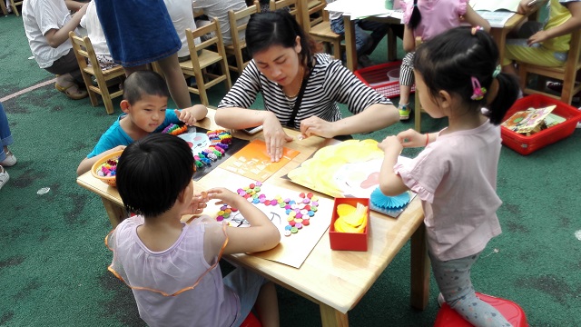 纽扣、毛茛、彩纸、毛球材料可是宝贝们的最爱,瞧,这些材料在小朋友的小手翻飞中,一个个华丽丽的变身啦!毛茛卷一卷,变成了时髦的卷发,纽扣贴一贴变成了彩虹发型,彩纸折一折,变成了有趣的刺猬头,一旁的爸爸妈妈看得啧啧赞叹,忍不住翘起大拇指,宝贝的创意太牛啦!