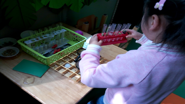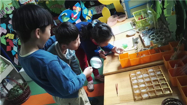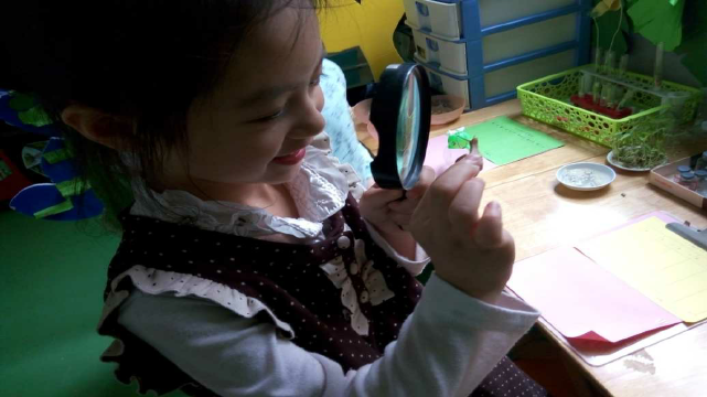 为了给孩子们创设一个更为贴近自然的空间,我们把教室打造成了室内版密野仙踪,在这里,孩子们身临其境,好像天天置身于自然界之中。 我们用放大镜观察蜗牛是如何走路的,它的眼睛在哪里…;晨间活动时偶然发现的小瓢虫是我们课后讨论的新宠;豆豆发芽都见过,但放在透明试管里观察豆豆生长这个办法你们见过吗··· 这里成了小朋友课后最爱逗留的地方,或观察或讨论,俨然都是一个个自然小博士!陶行知先生说过,生活即时一本活的教科书,和自然角的互动,无时无刻不是生活中的一部分,无时无刻不是一个教育的好时机。