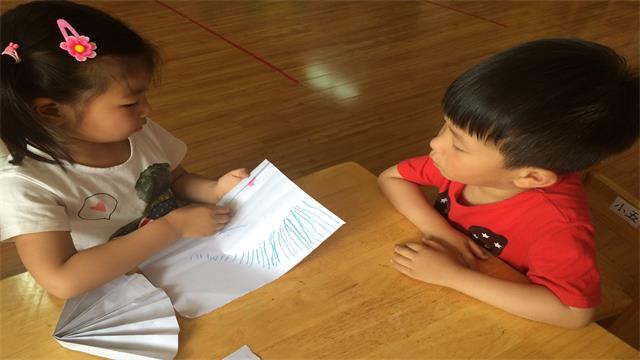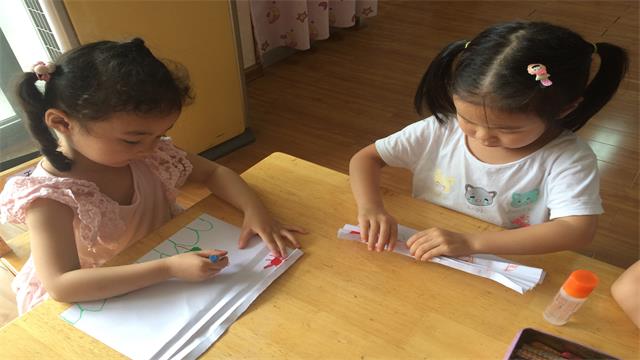 在老师的组织带领下,孩子们一方面亲身体验着夏日的炎热,一方面感受着冰的温度、探索融化的过程,冷和热的反差使幼儿产生了极大的探索兴趣,增添了对夏日特征的了解。“我眼中的夏天”、“怎样使人凉快”……一个个问题正是激励幼儿主动探索的契机。看,这是孩子们在自己在制作扇子。一张A4纸、一盒彩色蜡笔、一根胶棒,折一折、粘一粘,一把扇子就做好了,哇,好漂亮的扇子呀,扇一扇,好凉快哦。