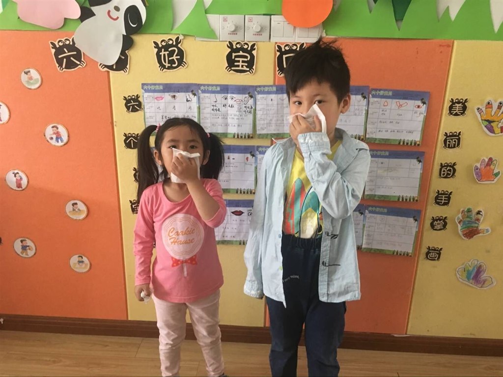 最近班里有的宝贝感冒了,有时打喷嚏突然就会打了出来把边上的小伙伴们吓坏了。 “我们打喷嚏该怎么做呢?”于是老师们惟妙惟肖的表演了起来,宝贝们也和老师一起表演着。这真是太好玩了!通过这一环节宝贝们知道喷嚏咳嗽要转过身,用小手或纸巾捂着,还能保护好他人。