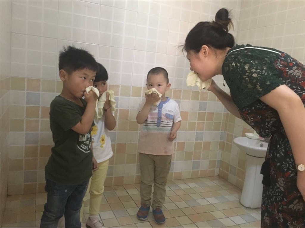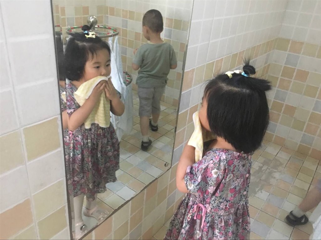 餐后和点心后,孩子们总会拿起干净的毛巾仔细地擦干净小脸蛋,爱美的孩子还会对着镜子照个不停,然后自豪地对着老师说“小花猫不见了!”“我擦的干净吧!”