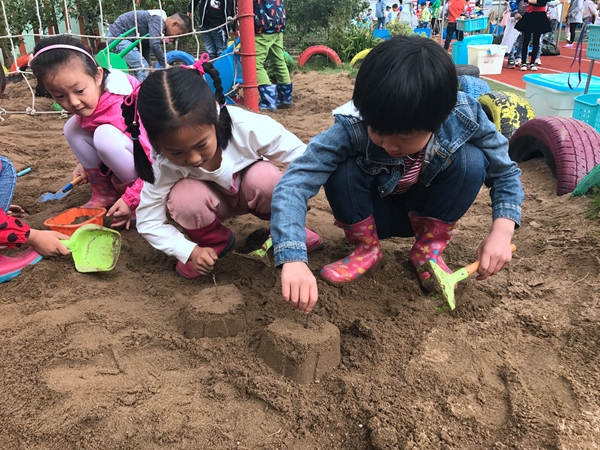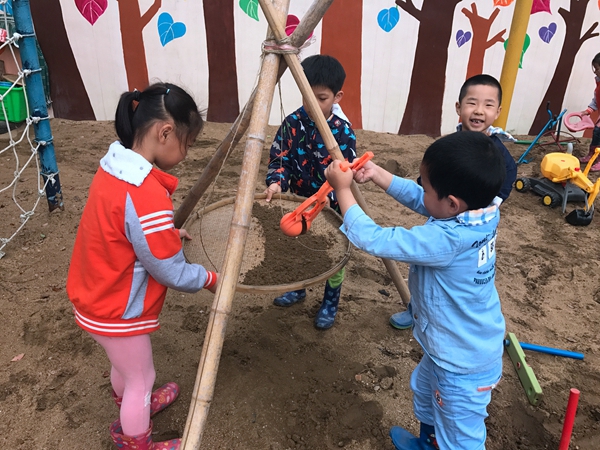 在孩子们眼里,沙子魅力无穷。因为沙是变化无穷的原始素材,它引发着孩子强烈的好奇心和求知欲,满足了孩子创造的欲望。富有创造性的环境造就创造性的孩子,每一次玩沙的过程都是孩子与老师、与材料互动的过程,是孩子们创造的过程,是孩子们自主发展的过程。