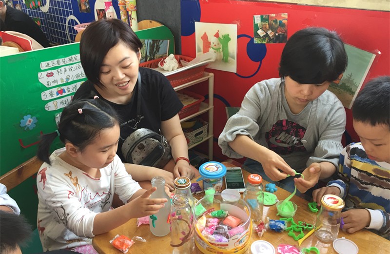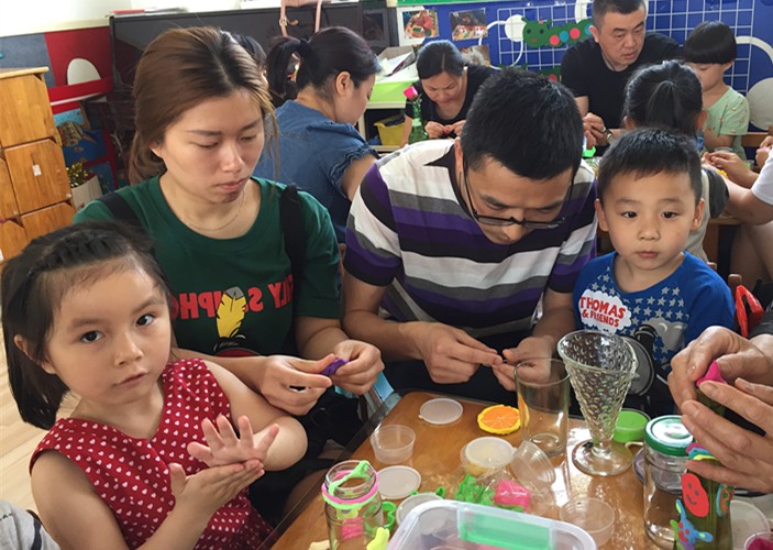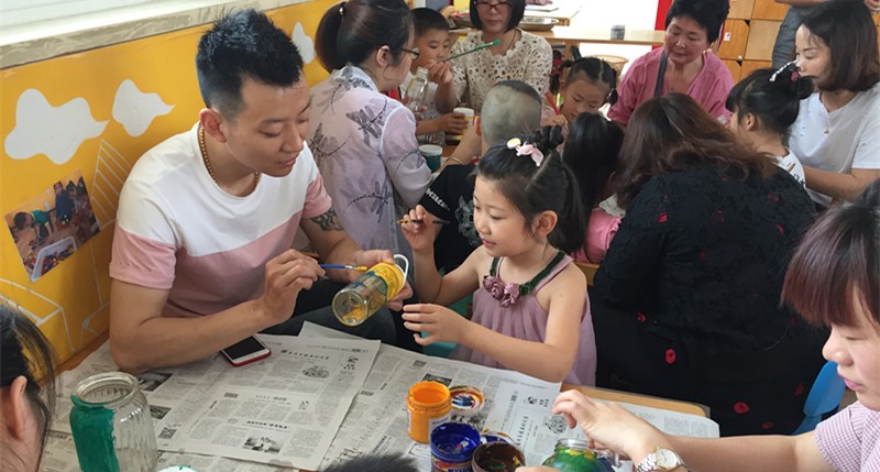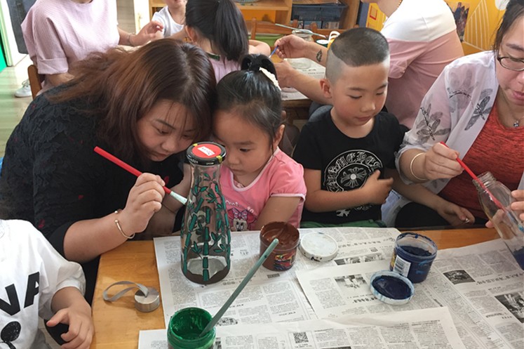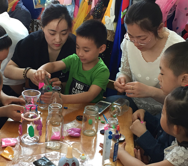 孩子们兴奋异常,早就想跃跃欲试。爸妈们也不含糊,开始利用我们的网络资料,在网上找好要做的图片,对照着开始进行。有的家庭分工合作,先是一起商量做什么样的装饰,再由爸爸分配任务,主体部分大人做,边上的装饰孩子做。有的家庭是由孩子独立完成,爸妈给一些参考意见。瞧,孩子们做得热火朝天,没过多久,这些闲置在家的玻璃瓶已经披上了炫丽的新衣,当全部作品完成以后,孩子们都惊叹“太美了!”。