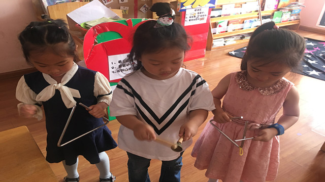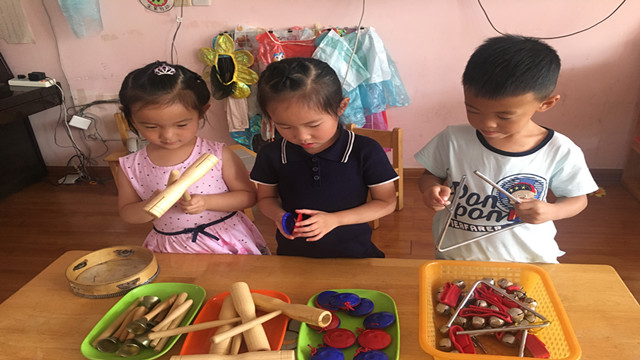 接下来“声音大聚会”就要开始咯!宝贝们跟着音乐的节奏,敲打着自己的乐器,一会儿重重地敲,一会儿轻轻地敲,一会儿快快地敲,一会儿慢慢地敲,还变着花样敲了!他们敲的可开心了!