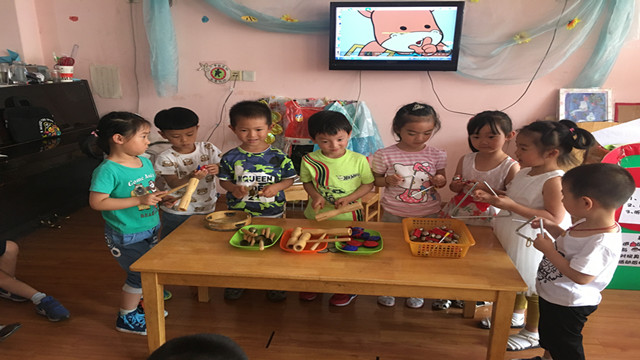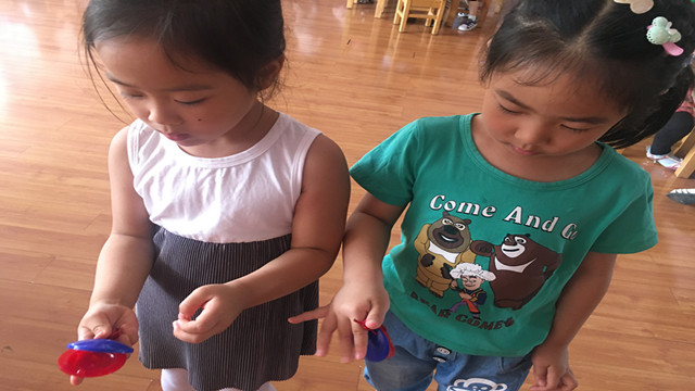 你们看这一个个头都聚在一起在看什么了?哦!原来今天老师给小朋友们准备一些工具,让孩子们先了解这些都是用什么材质制成的,他们分别敲出来的声音有什么不一样呢?让小朋友们亲子体验和感受这之间的区别。小朋友们拿到东西后左边敲一敲,右边甩一甩,然后跟旁边的小伙伴说:“你看,我跟你发出的声音不一样耶!好神奇啊!”是呀,它们的材质不同,所以发出的声音也不一样哦!
