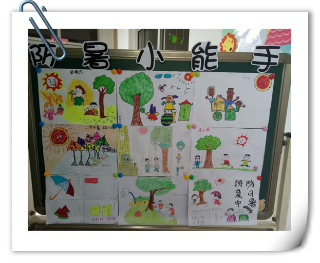最后,以“防暑我知道”为题的防暑降温画展也如期在各班举办。孩子们和家长一起用画笔描绘出自己心目中的防暑本领。