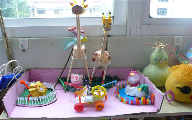 结合园本特色课程,孩子们与家长利用废弃的塑料瓶、泡沫盒、纸盒等物品,变废为宝,在制作过程中提高了幼儿对垃圾分类的认识,且通过作品呈现出幼儿对此次活动的理解。