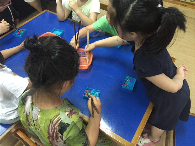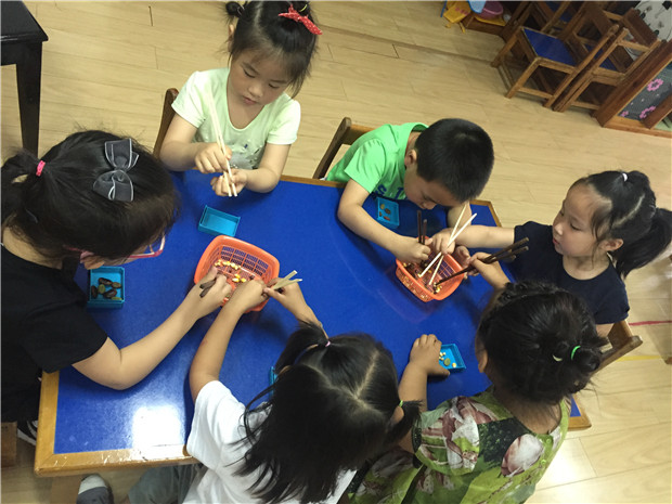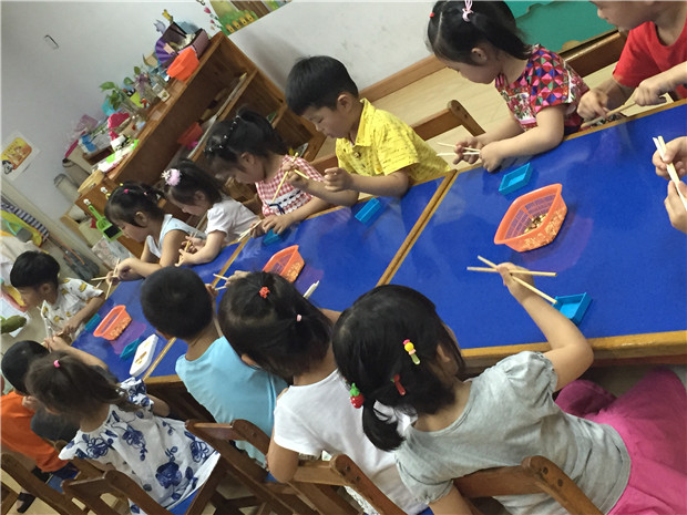 为了激发幼儿使用筷子的兴趣,老师们想着法的用各种材料给孩子们练习:彩色的塑料宝石、毛线球、毛根、还有各种各样的豆子……孩子们在边玩儿边学中练习筷子的使用技巧。