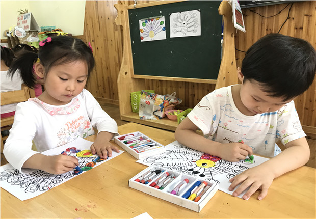 创作开始啦,孩子们聚精会神地创作着,那专注的小神情俨然一个个小画家。孩子们根据自己在课堂上观察的孔雀姿态和老师的讲解,加上自己的想法,勾勒出了一只只美丽又充满童趣的孔雀。接着,孩子们还根据自己的喜好,给孔雀涂上了漂亮的颜色,一只只漂亮的小孔雀就诞生啦!