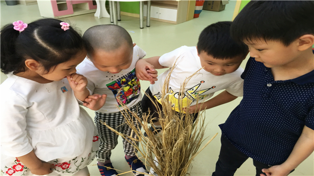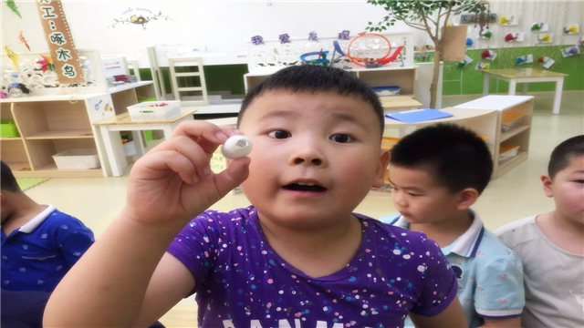 果然第二天,稻草堆里就出现了一个白色的茧,小朋友看了高兴地拍起了手。一天天,随着时间的推移,白色的蚕茧越来越多,“老师,白色的蚕茧里面会有什么呢?”“这个问题老师先不回答,你们慢慢观察。”就这样,小朋友每天依旧会去看看蚕茧,左看右看,就想知道蚕茧里面藏着什么。有一天下午,小朋友们午睡起床,甜甜发现蚕茧的顶上出现了一个黄色的小洞,旁边还有几只煽动着翅膀的飞蛾。老师将飞蛾重新放到盒子里,让飞蛾继续交配、产卵,这样明年的现在又会有新的蚕宝宝出现啦!