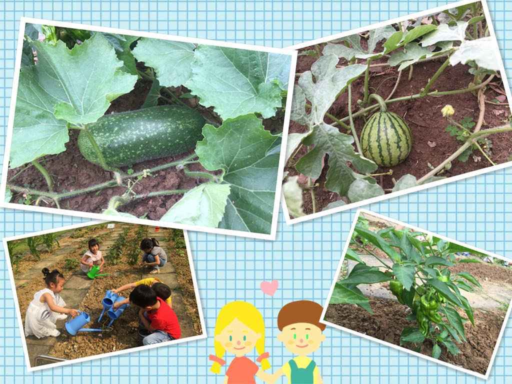 每天早上孩子们带上小锄头、铲子、水桶等工具来到幼儿园内的种植园开始忙碌起来,老师指导孩子们翻土、浇水、拔草,大家忙得不也乐乎。瞧,菜园里呈现一片欣欣向荣的景象。“快看快看,我们的西瓜娃娃长出来了,小小的好可爱啊!”有个孩子高兴地大喊,这下吸引了一群围观者,在绿油油的瓜藤里藏着几个圆溜溜的“绿娃娃”,孩子们探头张望着、讨论着、用手比划着。不一会,另一边又有孩子喊起来:“哇,快到这边来,冬瓜宝宝又长大了好多。”小伙伴小心翼翼地翻开冬瓜藤,“冬瓜的身上长了好长的毛毛。”辣椒也是琳琅满目,硕果累累;玉米秆儿绿油油,长高长壮了;向日葵长得高高的,迎着阳光露出了笑脸……每次观察,孩子们总会惊奇的发现各种植物都在发生不同的变化,在孩子们