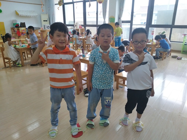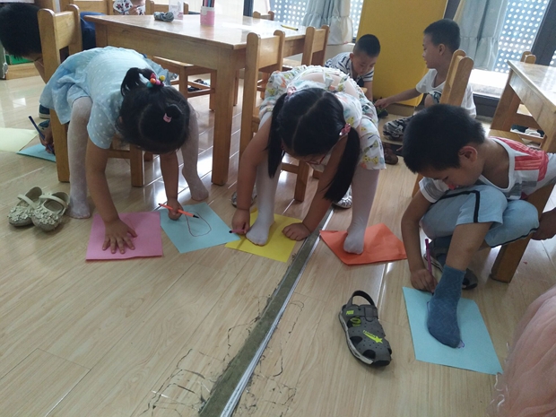 瞧,设计师们拿起画笔,脱掉鞋子、袜子,沿着自己的小丫子像模像样的打起手稿来;紧接着他们又拿起彩笔进行着装饰:夏天的小花、漂亮的风筝、有趣的数字、最美的自己都成为孩子们装饰的要素,再涂上五彩的颜色真是漂亮极了;最后,小小设计师们又给自己的凉拖设计最新的款式了,有的是两根带子交叉的,有的是时下最流行的一字拖……款式各种各样!小小设计师们都忍不住自己试穿起来,还有模有样地走起了时装秀!