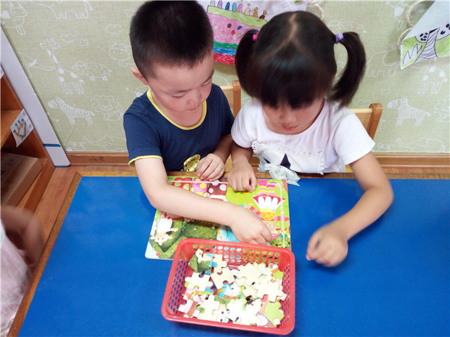 在教师介绍完规则后,孩子们开始了紧张而激烈地进行拼图,他们在拼图板上一块一块地寻找属于它们自己的位置。瞧他们显得多有经验呀,从拼图板的边缘开始,然后再拼摆中间部分。有的手忙脚乱,有的镇定自若。孩子们看着散乱的图片在自己手里拼出了美丽的画面,都十分开心,体验了成功的快乐。
