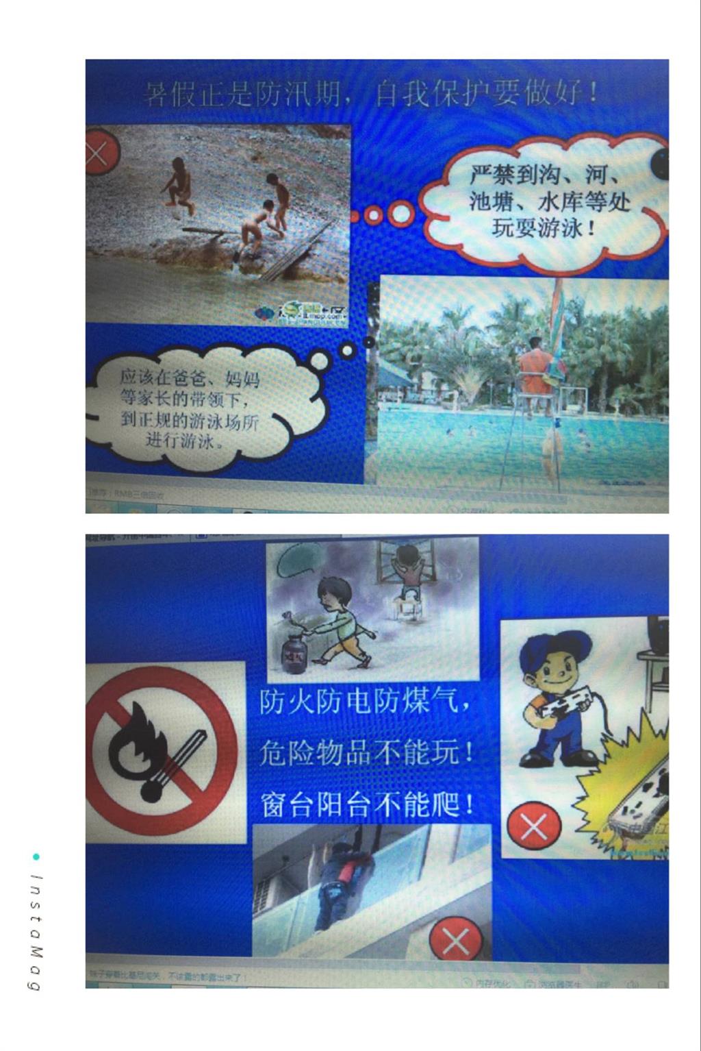 首先,在本学期最后一周的升旗仪式上,老师在国旗下讲话中对孩子们进行了假期安全教育,其次,各班级教师通过孩子们喜闻乐见的故事、视频、游戏等形式把防溺水、交通安全、食品安全、防意外伤害、防雷电、防火、防传染病等安全常识教育等融入其中,让孩子们懂得放假期间要注意交通安全,不玩火玩电,不暴饮暴食,不私自外出,预防手足口等传染病、防止烫伤、摔伤、被拐卖、食物中毒及溺水事故的发生,丰富多彩的活动提高了孩子们的自我保护能力。