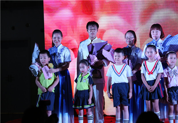 音乐响起,大班的全体老师们身着表演服装,款款走上台。孩子们一看到自己班的老师站在舞台上,瞬间兴奋不已。紧接着,伴随着沙画视频的播放,教师们开始了声情并茂地朗诵。一句“六月的幼儿园喧闹而繁忙,六月的我们因离别而忧伤”,渲染了现场氛围,不少家长和孩子晕红了眼眶。在孩子们正在感慨舍不得离开幼儿园和老师的时候,老师们一句“满载着老师的祝福,满载着爸爸妈妈的期待,如雏鹰般飞向更遥远的天际……”,把活动推向高潮,表达了老师对孩子们的祝福。最后,小代表们上台给亲爱的老师献花,感谢老师们三年来的悉心教导。