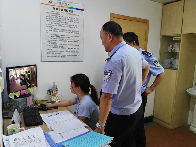 临近学校暑假来临,为了进一步做好校园内外安全防范工作,确保学校安保平稳有序,近日,新丰派出所民警来到小金星兆丰幼儿园进行走访调查,民警查看了各类技防设施,重点对财务室的技防要求进行了强调;了解保安人员巡查校园的工作情况,查看了保安的台帐资料;还对幼儿园消防设备的有效期进行了核验;调看并审核了30天监控录像;对教师随机的安全教育给予了高度评价;