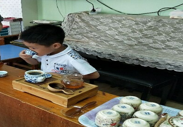 课上,老师给孩子们“科普”了茶文化,茶叶焙制、茶具种类及茶的分类、功效,以及茶叶的相关民俗,正在指导小朋友依次进行赏茶、备器、泡茶、敬茶、品茶等程序,同时配以古色古香的音乐,孩子们立刻提起了精神,来了兴趣,进行沏、冲、泡、煮等不同尝试,并且细细品啜着各味茶汤。孩子们接受能力很强,一招一式都做得非常到位。