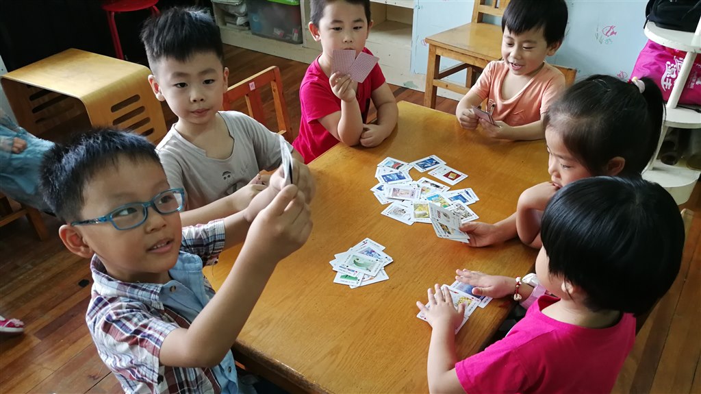 当然扑克本身作为一种益智游戏肯定是充满趣味的,孩子们的扑克益智游戏就此开展。“小猫钓鱼”,孩子们依次添加纸牌,看到重复数字的纸牌就要回收。这款具考验反应能力的小游戏着实让孩子们兴奋了一把。如果“小猫钓鱼”看反应和智慧,那么“抽乌龟”的游戏就变的特别看运气。孩子们的“演技”在这个游戏中表现的淋漓尽致,为了让手中的大王被他人抽去,一个个表现的若无其事的样子,特别可爱真实。