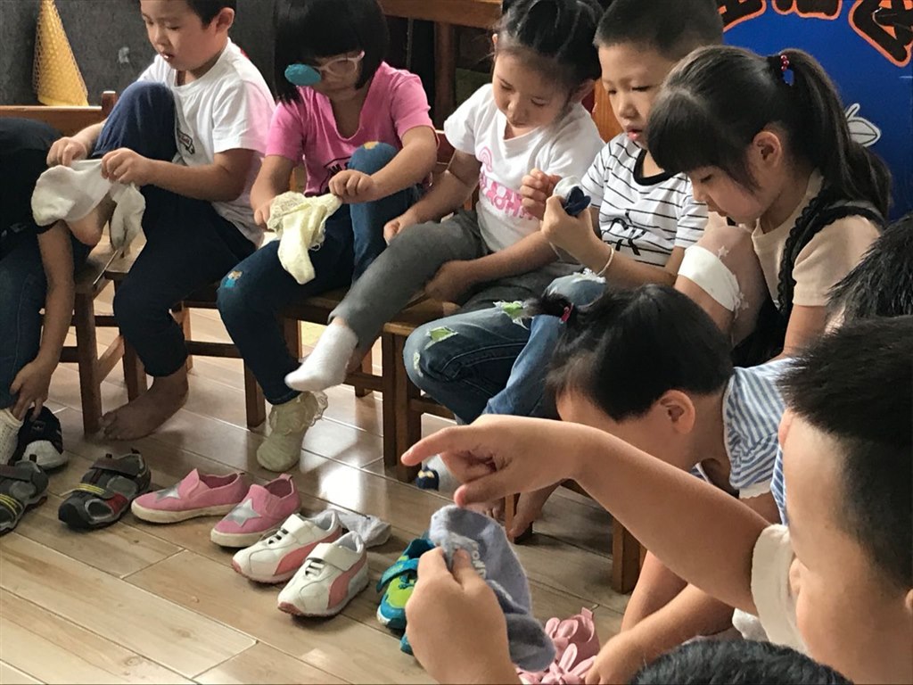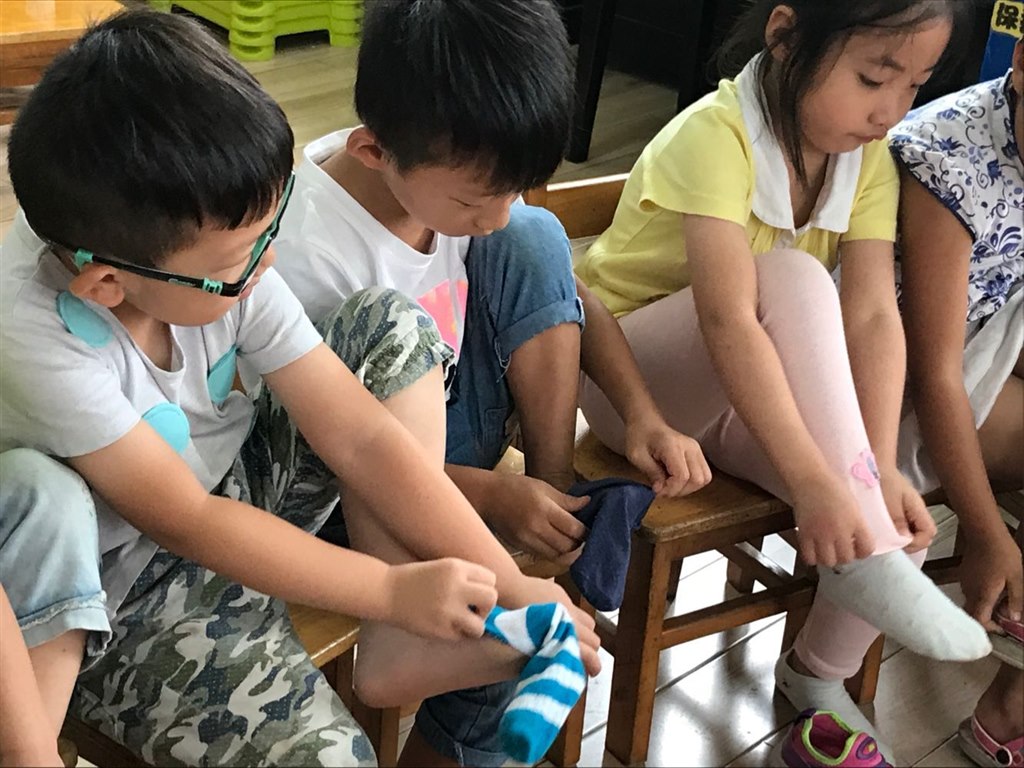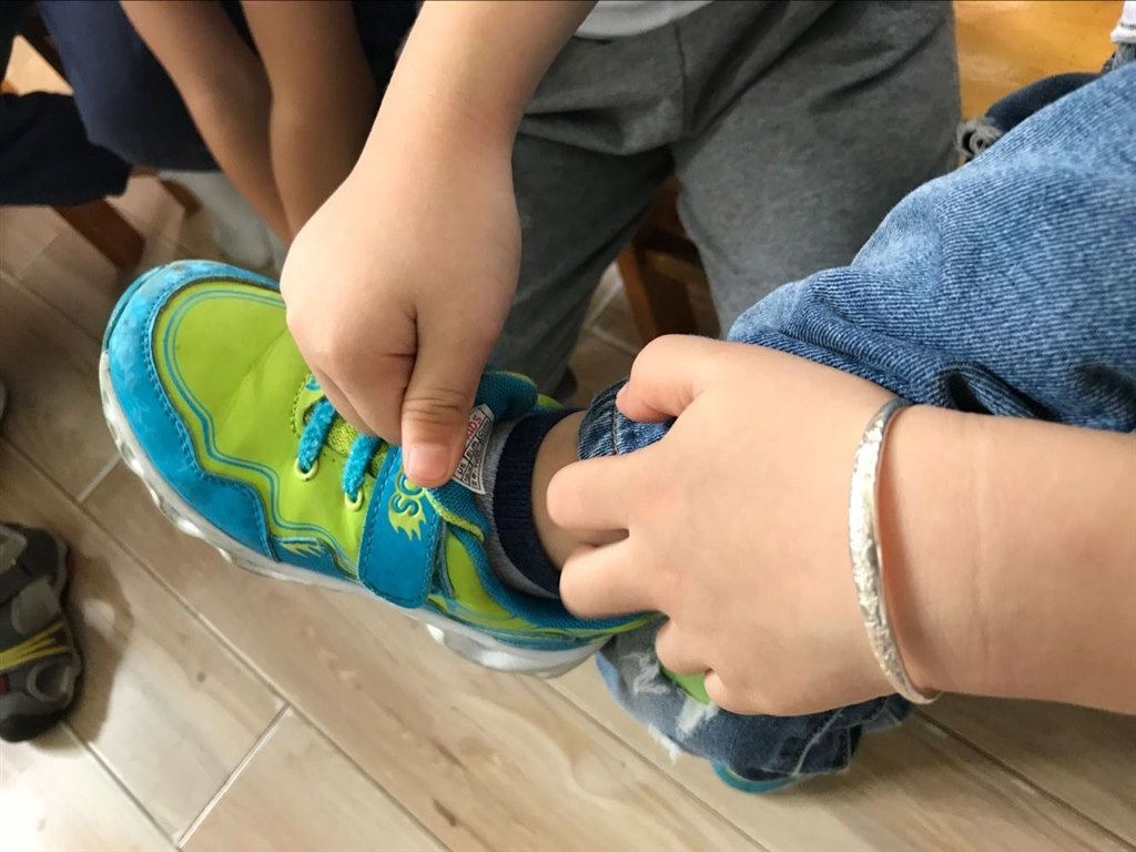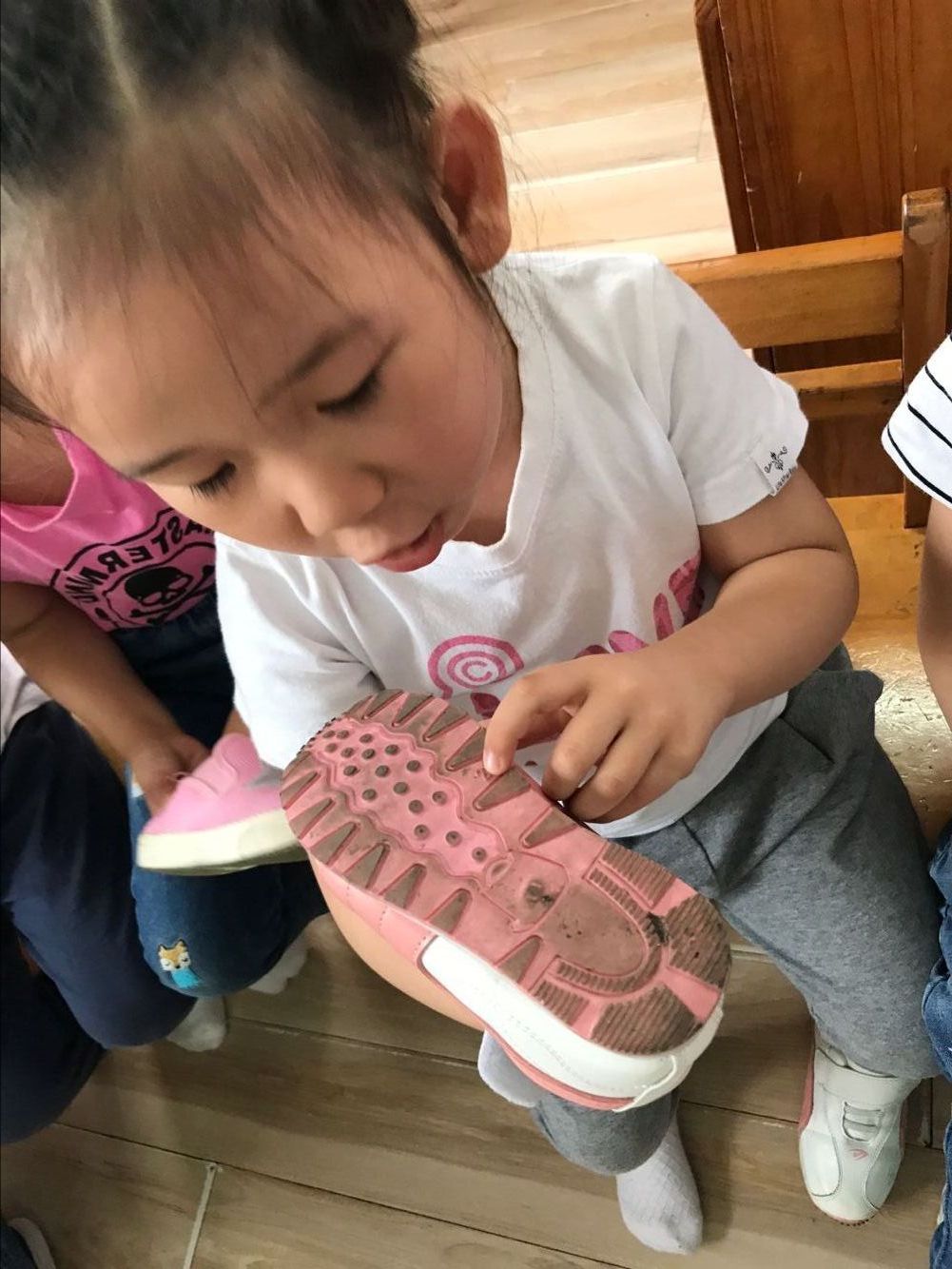 瞧,红东幼儿园中三班的老师利用《小脚的朋友》这一活动,让幼儿在认识小脚的朋友是鞋子和袜子的基础上,知道鞋码,学会正确 的穿脱鞋子,了解袜子、鞋子能保护自己的脚。