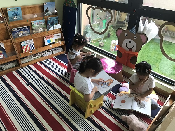 根据幼儿的阅读需求,将阅读区投放光线明亮的窗边。并将一侧临靠墙壁,形成半开放式的格局,营造一种安静、安全的氛围,同时能吸引区域外的幼儿前来参与阅读活动。