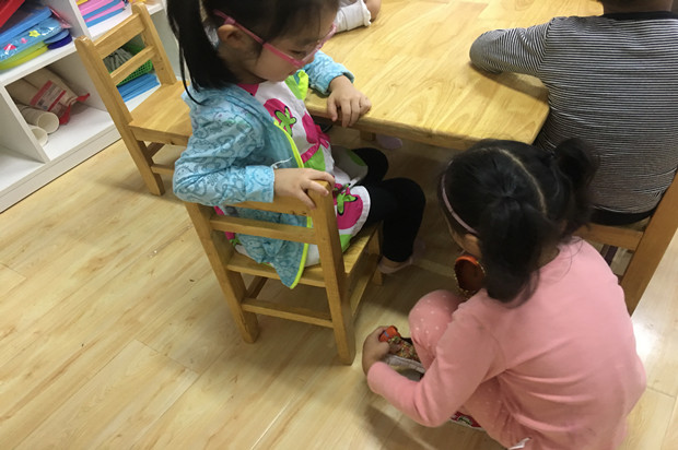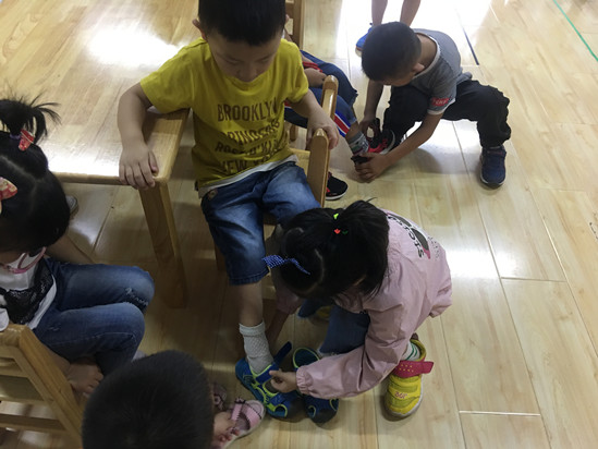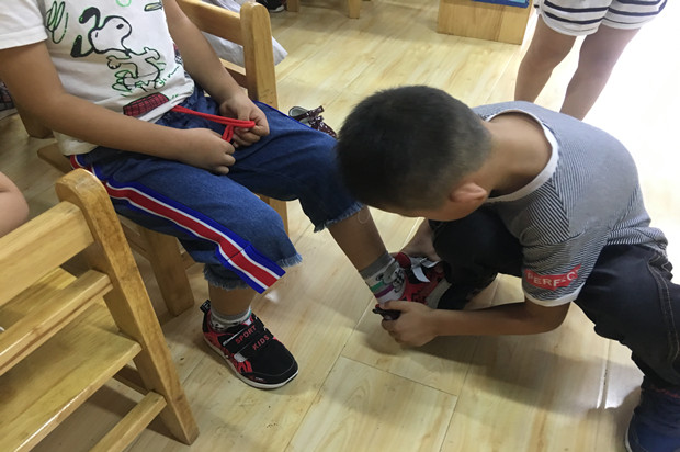 瞧,大班的哥哥姐姐们来到中班弟弟妹妹中间,一对一式的进行照顾。有的帮哭泣的弟弟妹妹擦眼泪;有的带着弟弟妹妹去户外做游戏,并提醒他们要慢慢走。有的哥哥姐姐帮弟弟妹妹细心的穿鞋子、穿衣服。处处彰显出大班哥哥姐姐的能干。