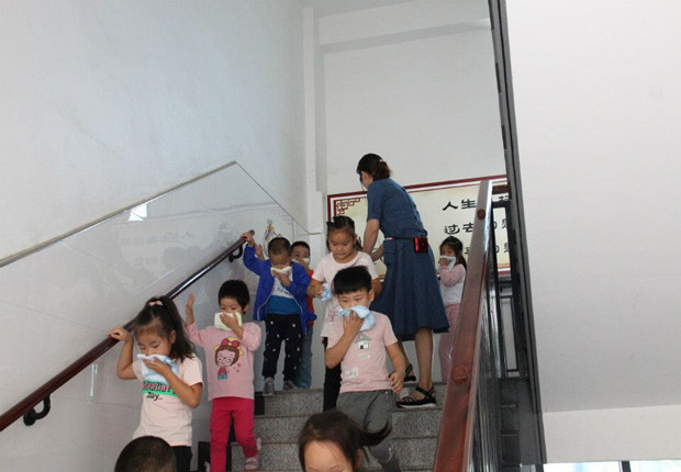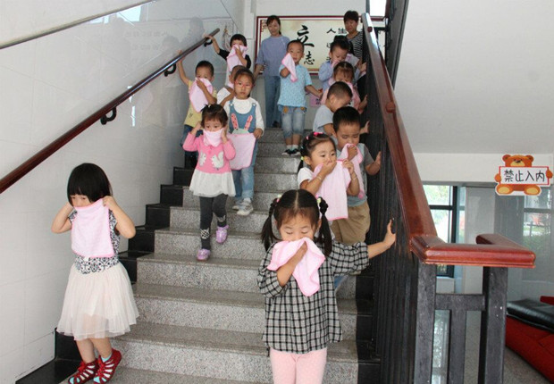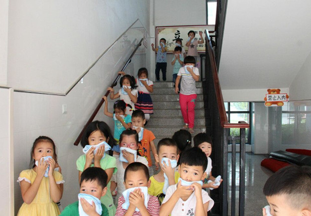活动前,各班教师将培训学到的消防知识及时的向幼儿们进行了宣传教育,使幼儿们对消防知识有了进一步的认识。上午10:00,警报声响起,各班教师迅速按紧急预案的疏散线路带领幼儿拿起毛巾,捂住口鼻,猫着身子,分两队从楼梯迅速且有序下楼。很快孩子们集中到一楼安全地带,教师迅速地清点人数,整个疏散活动只用了2分多钟。活动结束后,王园长还对各班的演练情况进行了及时的点评和总结。