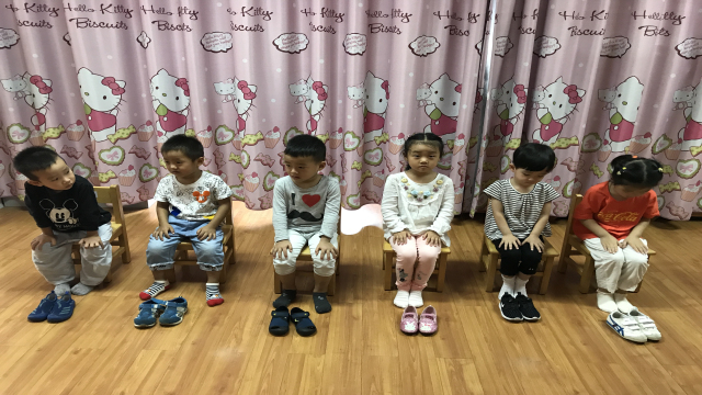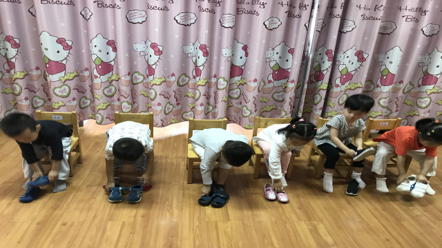开学两周了,彩虹幼儿园小班的小朋友已经渐渐适应了幼儿园的生活,为了提高孩子们的自理能力,今天我们小三班的娃娃们进行了一次自理能力的比赛——穿鞋子比赛。