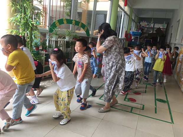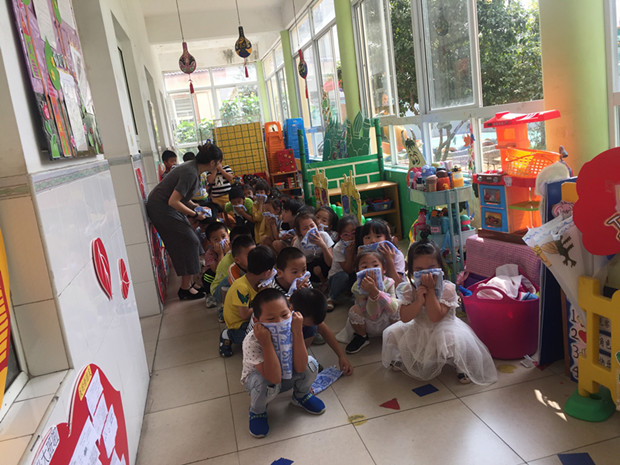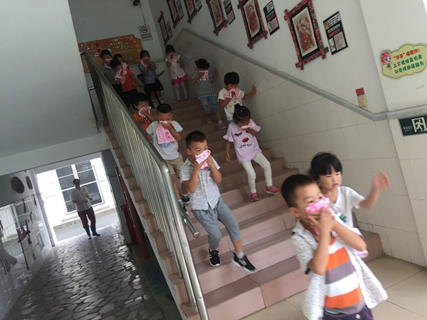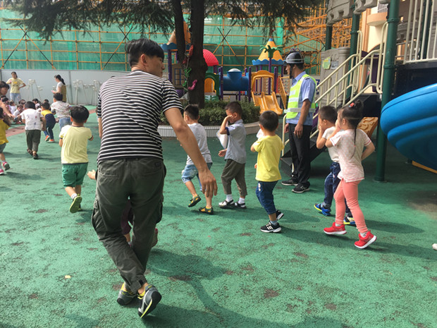为了进一步强化幼儿园教师和幼儿对突发事故的灵活应变能力,使幼儿掌握消防安全知识,从小培养消防意识,让孩子学会自我保护,遇到火警懂得快捷、有效的逃生的办法。9月13日上午,茶山中心幼儿园开展了“安全第一课消防来报道”消防安全演练活动。活动中,各班教师首先通过视频、PPT以及师生互动的方式,让幼儿明白在火灾中正确的逃生的方法和如何使用灭火器等相关的安全知识。10点钟左右,忽然响起紧急的警报声,各班教师迅速按紧急预案的疏散线路带领幼儿拿起湿毛巾,捂住口鼻,弯腰小步快走,分两道楼梯迅速且有序下楼,经过短暂的时间全园幼儿被疏散到安全地带。