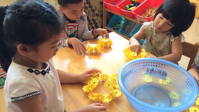 新城逸境幼儿园的中班孩子们为了响应园拓展建构室的活动,首先在教室里开始跃跃欲试啦。你瞧,普普通通的黄色雪花片在孩子们手下变成了超级风火轮、小花篮;彩色的小火箭也被巧妙地拼插起来,不一会儿两堵“墙”和其他部分就组合成了一个高高的迷你城堡呢,这可与平时孩子们随意搭出的完全不同呢!还有宝贝们聚精会神地观察着第一次接触的玩具,思考并尝试着用不同颜色的长条拼成中心的立交桥轨道呢,还有幼儿在小声交流着自己的想法。
